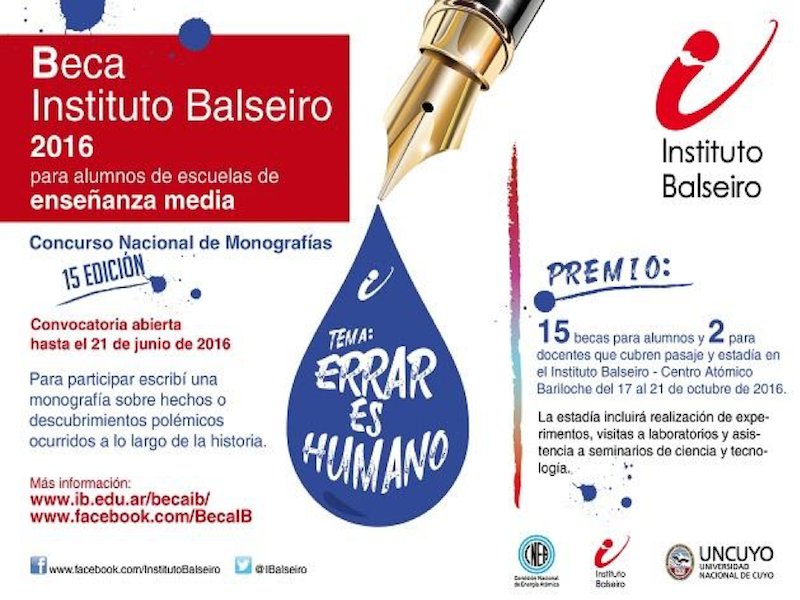 El tema de la edición de 2016 del concurso de monografías es: “Errar es humano: Caminos posibles hacia un descubrimiento científico”. El jurado del concurso premiará a 15 estudiantes y a dos docentes con la “Beca Instituto Balseiro para estudiantes de Enseñanza Media”. La misma cubre los gastos de traslado, el alojamiento en Bariloche y la alimentación. Las bases y condiciones de este certamen del Instituto Balseiro, dependiente de la Comisión Nacional de Energía Atómica y la Universidad Nacional de Cuyo, están disponibles en: www.ib.edu.ar/becaib. También se pueden realizar consultas vía becaib@ib.edu.ar.