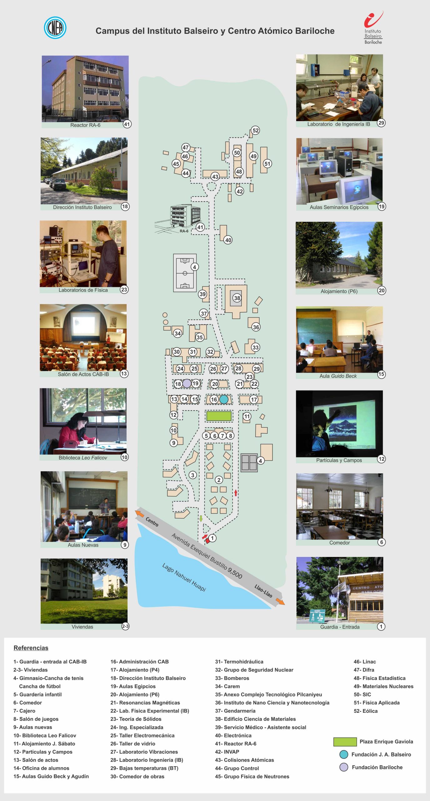 Within the campus there are research laboratories, laboratories for practices, classrooms, the RA6 nuclear reactor, library, housing for professionals residing there and student accommodation, a childcare facility, dining room, ATM, convenience store and spaces for various sports ; among other facilities that provide quality to everyday life for all who work and study at the IB as well as their visitors.