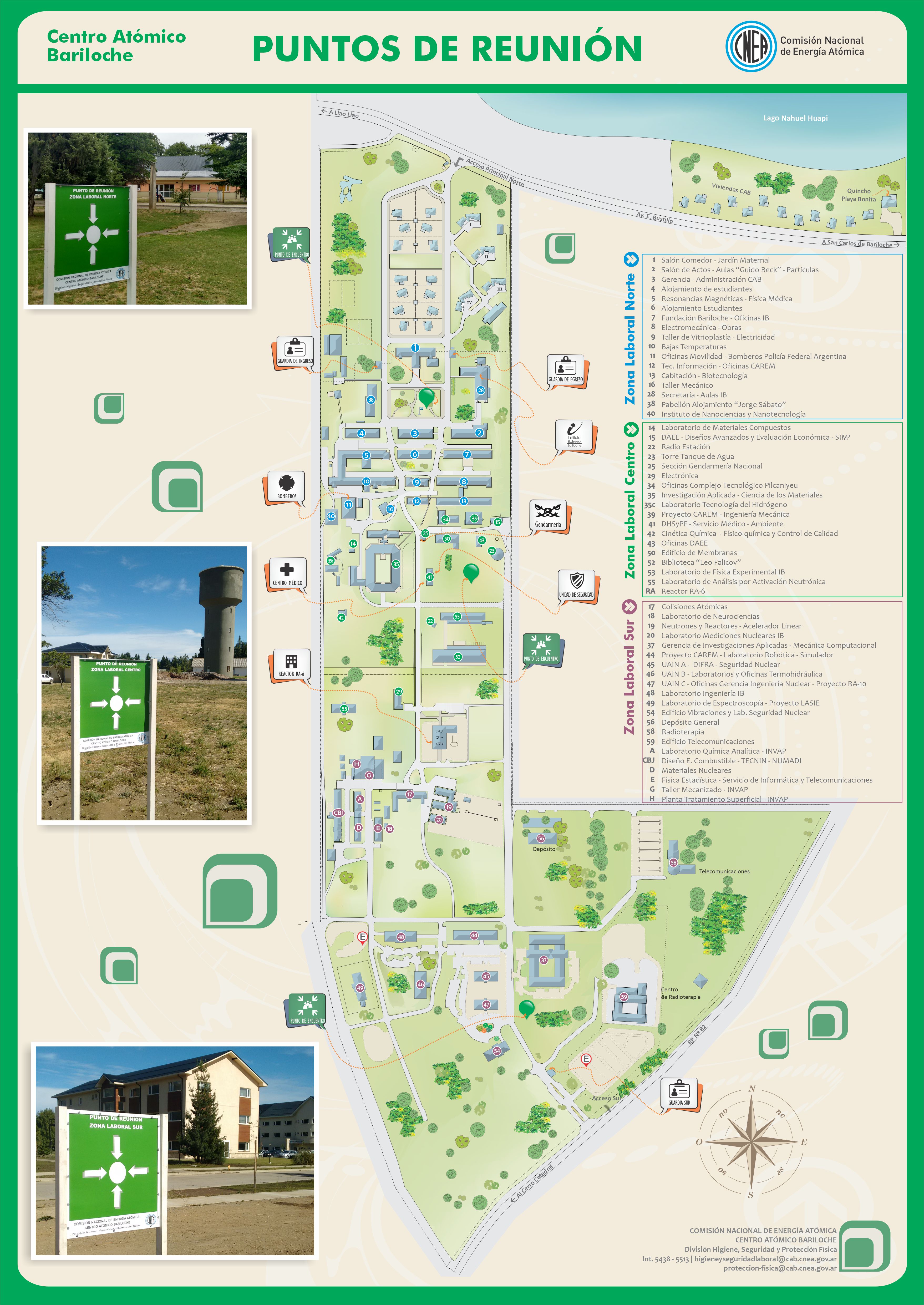 Dentro del campus se encuentran laboratorios de investigación, laboratorios para prácticas, aulas, el reactor nuclear RA6, biblioteca, viviendas de los profesionales que allí residen y alojamientos de estudiantes, jardín maternal, comedor, cajero automático y banco, almacén y espacios para diversos deportes; entre otros ambientes que facilitan y brindan calidad a la vida cotidiana en el quehacer de todos aquellos que desempeñan tareas en el IB así como a sus visitantes.