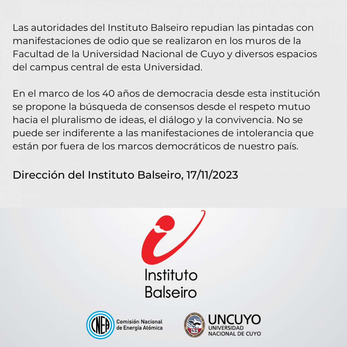 Las autoridades del Instituto Balseiro repudian las pintadas con manifestaciones de odio que se realizaron en los muros de la Facultad de la Universidad Nacional de Cuyo y diversos espacios del campus central de esta Universidad.