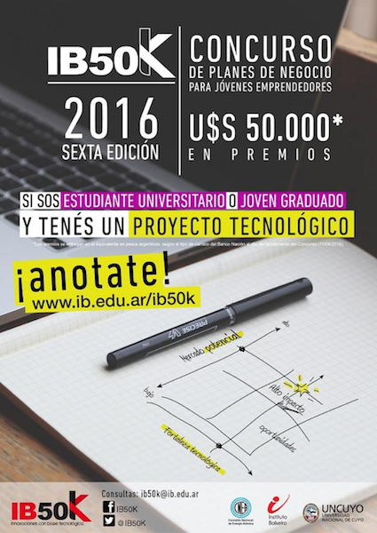 IB50K es un Concurso de Planes de Negocio con Base Tecnológica que desde el año 2009 promueve el Instituto Balseiro, dependiente de la Comisión Nacional de Energía Atómica (CNEA) y la Universidad Nacional de Cuyo (UNCuyo). El objetivo del concurso es promover la capacidad emprendedora de estudiantes y jóvenes profesionales, fomentar la creación y/o desarrollo de empresas de base tecnológica impulsando el desarrollo del país. Más información, en: www.ib.edu.ar/ib50k o ib50k@ib.edu.ar