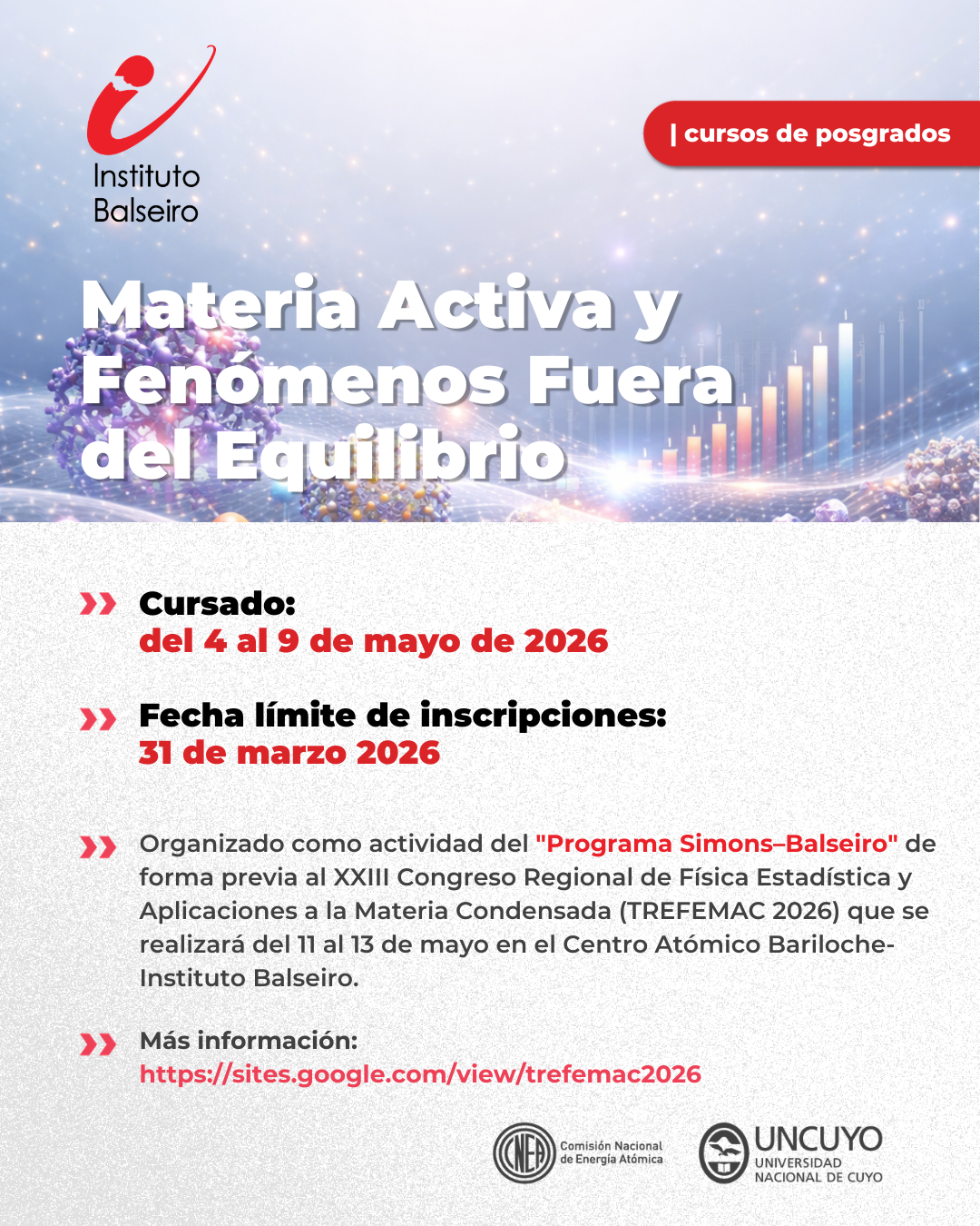 Inscripciones: Hasta el 31 de marzo estarán abiertas las inscripciones al curso de posgrado “Materia Activa y Fenómenos Fuera del Equilibrio”, organizado en el marco del Programa Simons–Balseiro, y a la vez están abiertas las inscripciones al XXIII Congreso Regional de Física Estadística y Aplicaciones a la Materia Condensada (TREFEMAC 2026).
